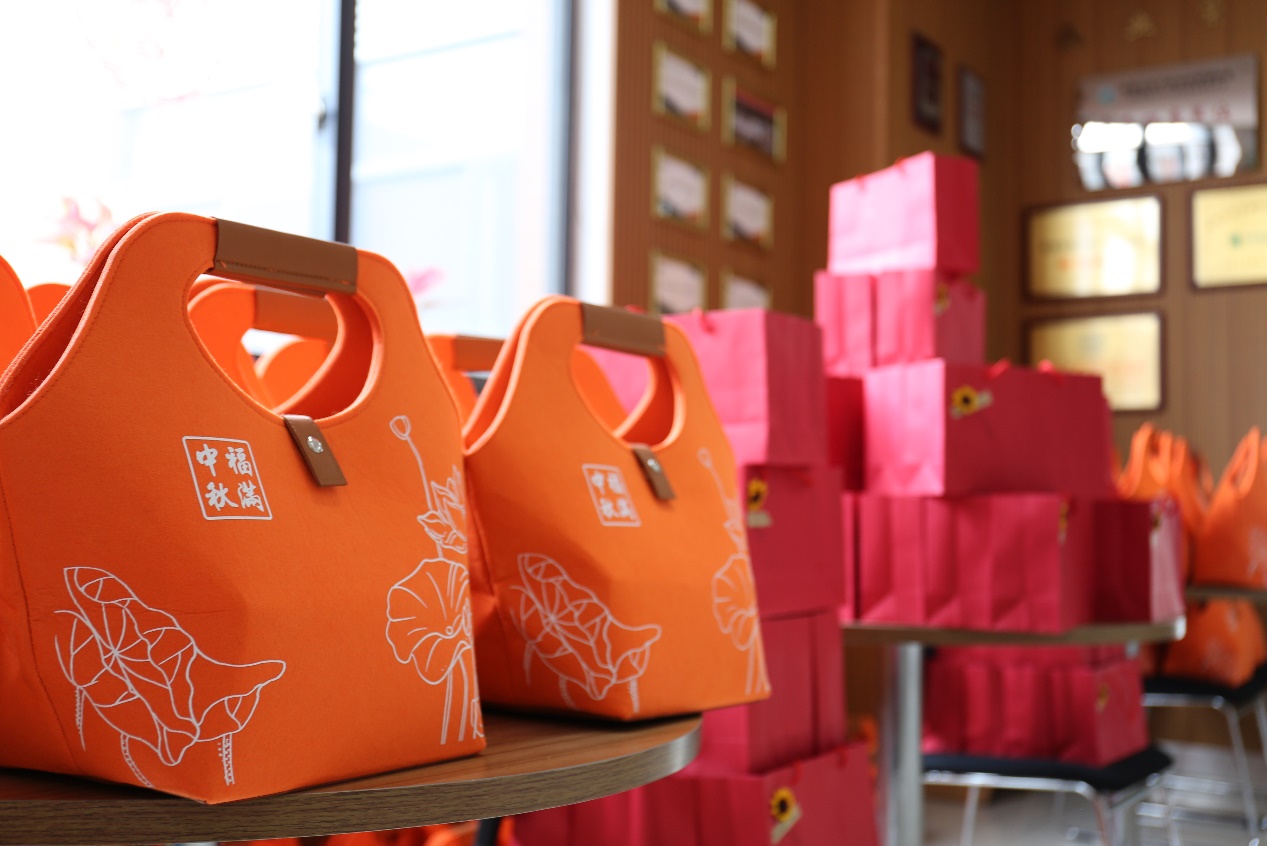 活動現(xiàn)場擺滿了紅包、月餅禮包和花茶禮盒,“愛馬仕橙”和“中國紅”交相輝映,一派喜慶!