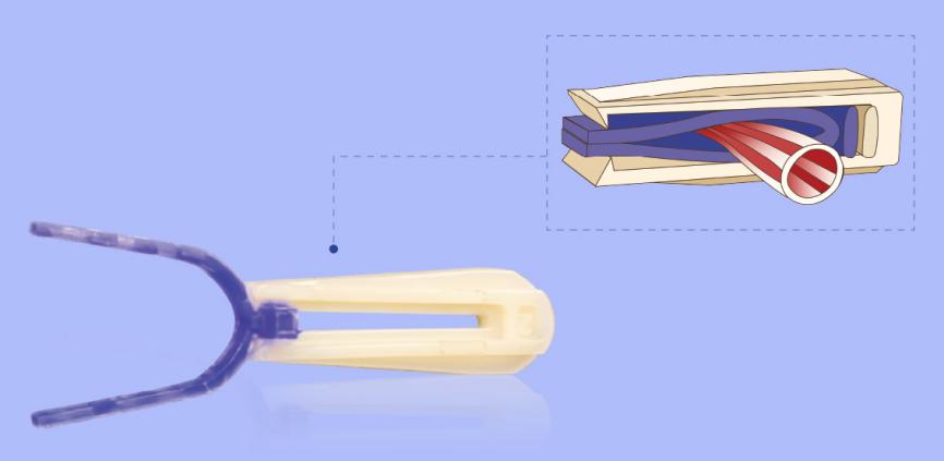 康蒂娜可吸收結扎夾由內夾、外夾、夾倉和活塞四個部分組成。其中,內夾、外夾為植入物,夾倉和活塞輔助內夾和外夾植入體內。